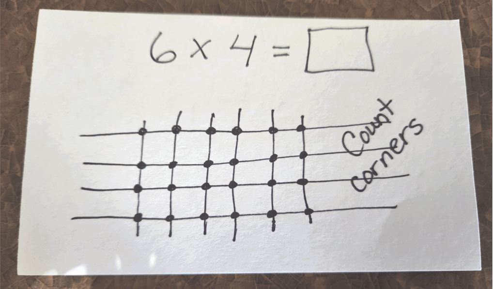 Visual learners benefit from arrays and grids. Representing 6 x 4 as 6 rows of 4 dots helps make the concept concrete. You can also use counters, LEGO bricks, or drawing grids to physically build the 6 groups. One of my favorite strategies is to draw vertical and horizontal lines for the factors and count the intersections. Like this: