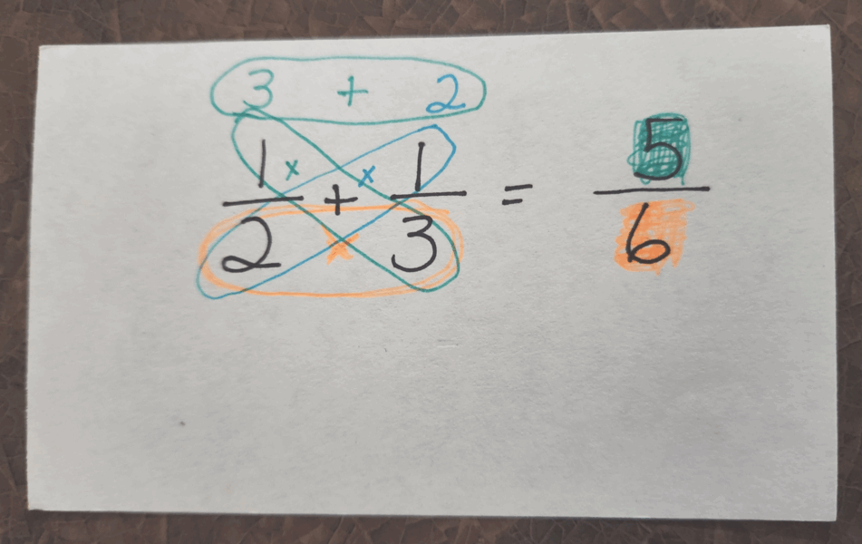 1/2 + 1/3 = 3/6 + 2/6 = 5/6