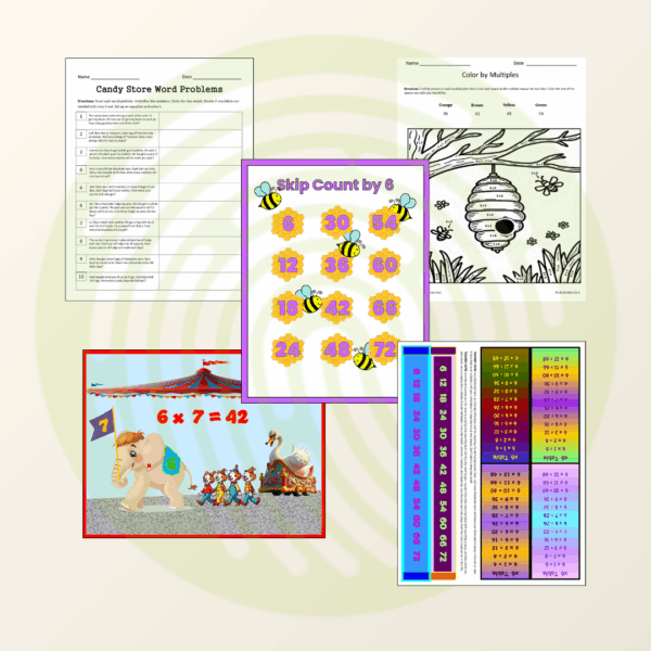 Look for catchy 6 times table songs on YouTube that will appeal to your child. There are many videos to pick from because music style preferences are different for different learners. Our Multiplication x6 Unit Study has a whole page of YouTube times 6 suggestions. Here’s one from Jack Hartmann, which pairs facts with visuals and strong rhythm.