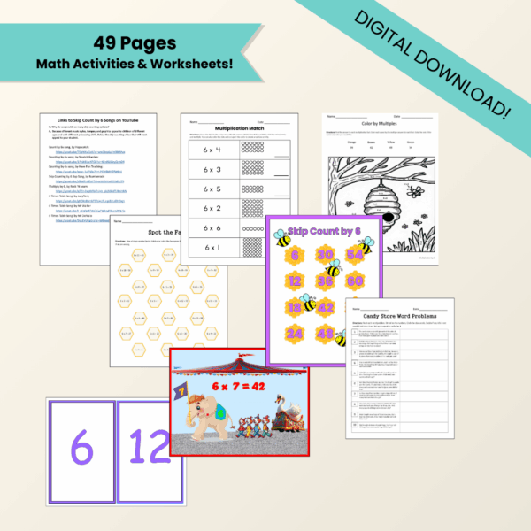 If you need worksheets, activities, and ideas, you will love our Multiplication x6 Unit Study! This downloadable file includes 49 pages of links, suggestions, worksheets, and a full-color file folder game!