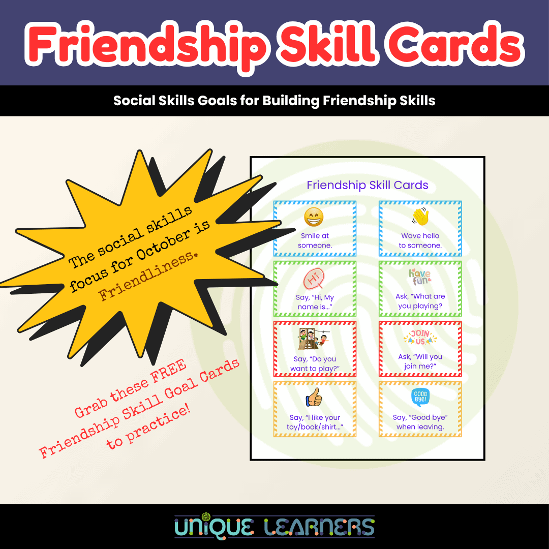 The social skills focus for October is Friendliness. Grab these FREE Friendship Skills Goal Cards as reminders for specific skills to practice.