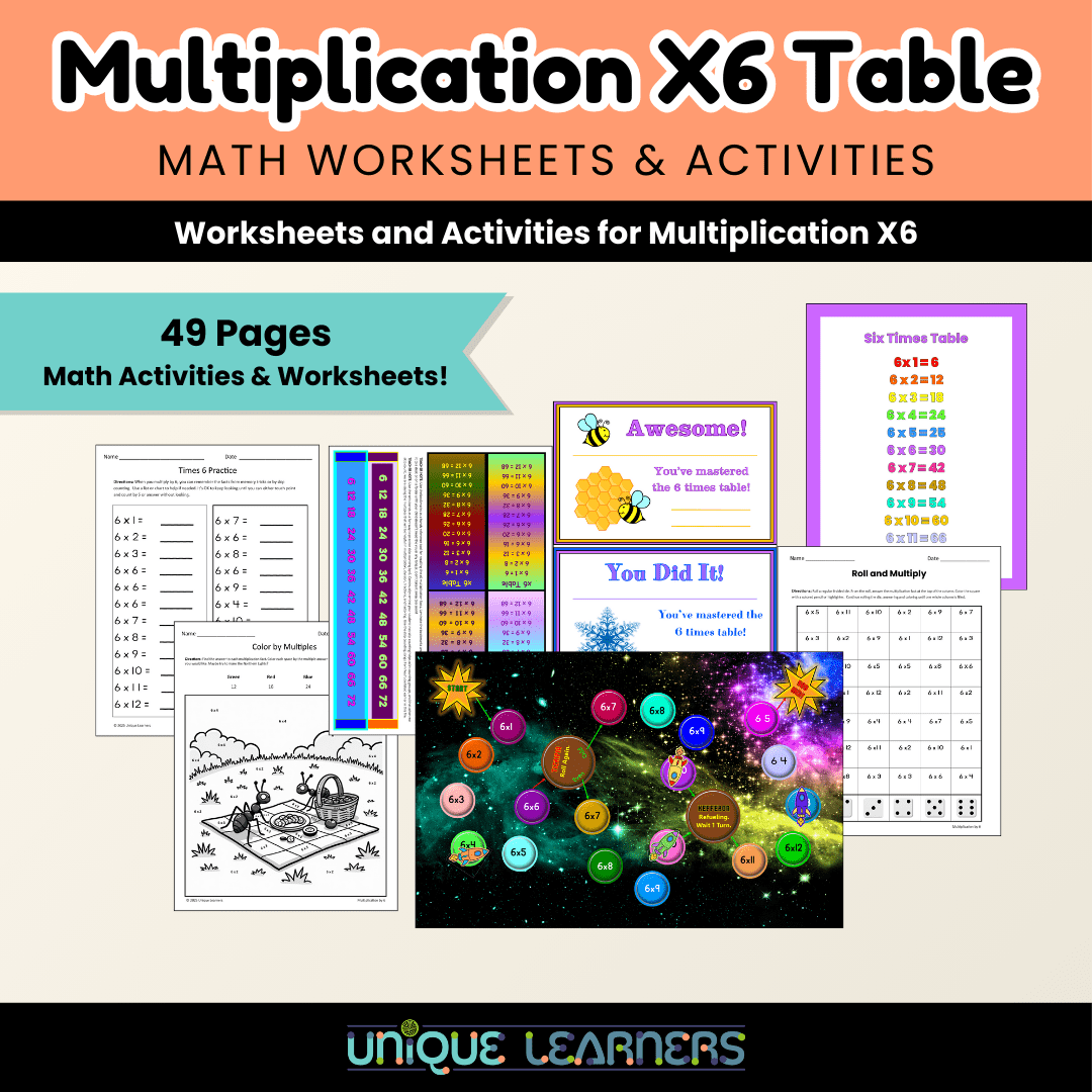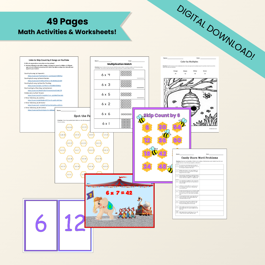 Our popular Multiplication Unit Study; this time for the Times 6 Table. This set has 49 pages of worksheets, multisensory activities, anchor charts, games, and hands-on activities.