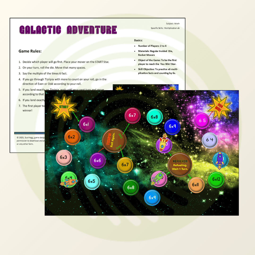 Here it is! Our popular Multiplication Unit Study; this time for the Times 6 Table. This set has 49 pages of worksheets, multisensory activities, anchor charts, games, and hands-on activities. If you have an upper elementary through high school student with dyscalculia or other math learning disability, you will find this unit study to be helpful in practicing multiplying x6 for mastery or renewed maintenance. Some of the pages are in full color. Some are black and white. Kids LOVE the Galactic Adventure Folder Board Game and will play it many times!
