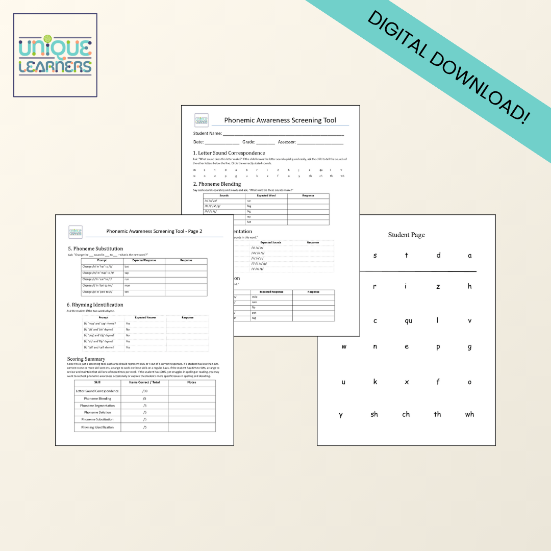This brief Phonemic Awareness Screening Tool is designed to identify early reading difficulties by evaluating core phonemic awareness skills in students from 4 year olds to older struggling readers. Ideal for use by homeschool parents or special needs tutors, this resource provides a quick yet thorough snapshot of a student’s phonological processing abilities.