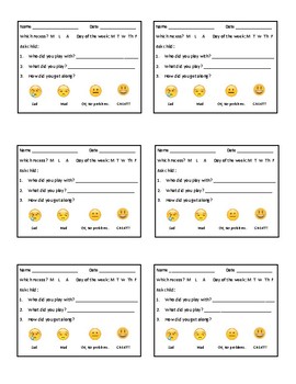 This simple form can be used by recess monitors, behaviorists, special ed teachers, or classroom teachers who need to monitor any child who requires specific follow-up on recess social skills. The form has a place to specify which recess and day of the week so that if a child is taking meds, the tracking can assist in questionnaires for effectiveness. The child is then asked who they played with, what they did, and how they got along with others. Familiar emojis are used for the scale rating with simple feeling words underneath. If sad or mad are the responses, additional individual follow-up can make sure the child is safe or has remorse. The ok and great ratings can provide opportunities to celebrate success in behavioral and social skills!