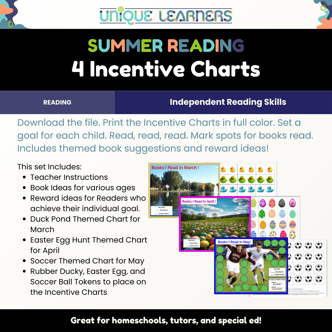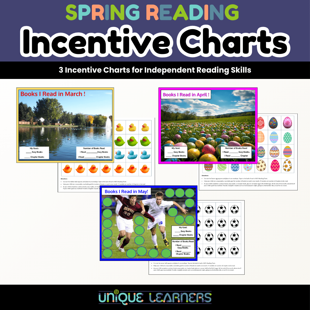 These Spring Reading Incentive Charts help keep kids reading as the end of the regular school year is in sight. Includes a Chart and Tokens for independent reading in March, April, and May. Also includes a Teacher Instruction Page, a list of book suggestions, and a list of reward ideas for when goals are reached.